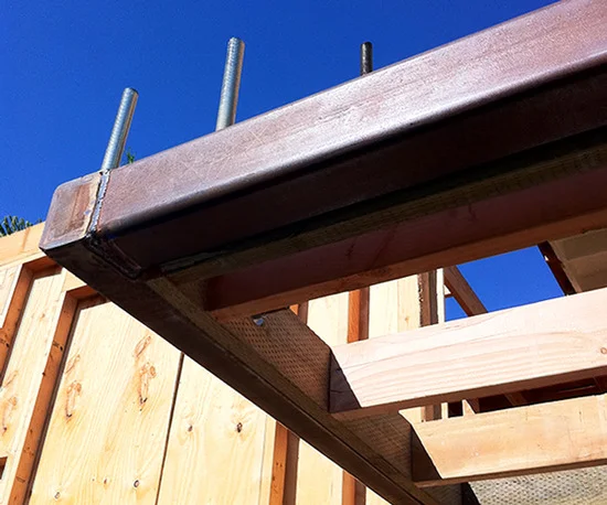 Due to the limited depth of the floor system, tube steel was required to support the new cantilever; the rest of the structure is wood-framed, with a couple shear panels at the opening shown below.